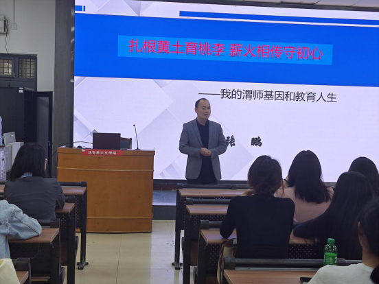 5月9日下午2:00,在1101,太阳成tyc122cc邀请2003级思想政治教育专业毕业生、潼关县优秀团务工作者、潼关县高考质量提升先进个人、渭南市中小学教师中、高级评审委员会评委、渭南市教育学会理事,渭南市高考政治学科试题评价分析讲师团成员、潼关中学副董事长张鹏老师来公司作题为《扎根黄土育桃李 薪火相传守初心》的报告。太阳成tyc122cc部分教师、思想政治教育专业2022级员工等100余人参加,思想政治教育专业建设负责人周菊芳主持。