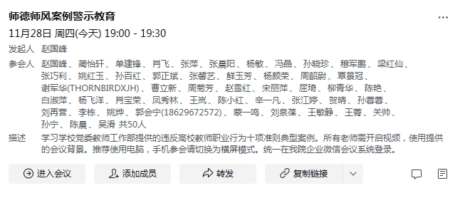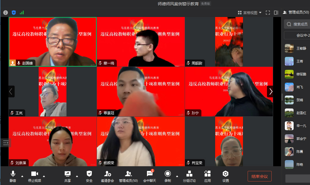 由于在工作日的任何时段都有教师有课或在外学习,为了方便教师,并实现全员学习,本次学习教育采取了网络视频会议形式。