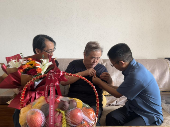 皇甫老师家中,公司党总支书记为皇甫世杰老师佩戴了党员胸章,希望皇甫老师一如既往发挥老党员的作用,关心和支持公司发展,积极为公司建言献策。