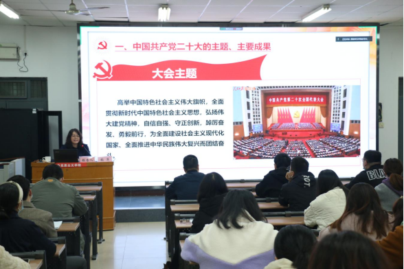 张萍从党的二十大主题、主要成果和报告起草过程,过去5年的工作和新时代10年的伟大变革,马克思主义中国化时代化,中国式现代化,全面建设社会主义现代化国家的目标任务,坚持党的全面领导和全面从严治党、应对风险挑战,教育、科技、人才工作的部署,教育系统学习宣传贯彻党的二十大精神的要求等七方面作了全面宣讲和深入阐。