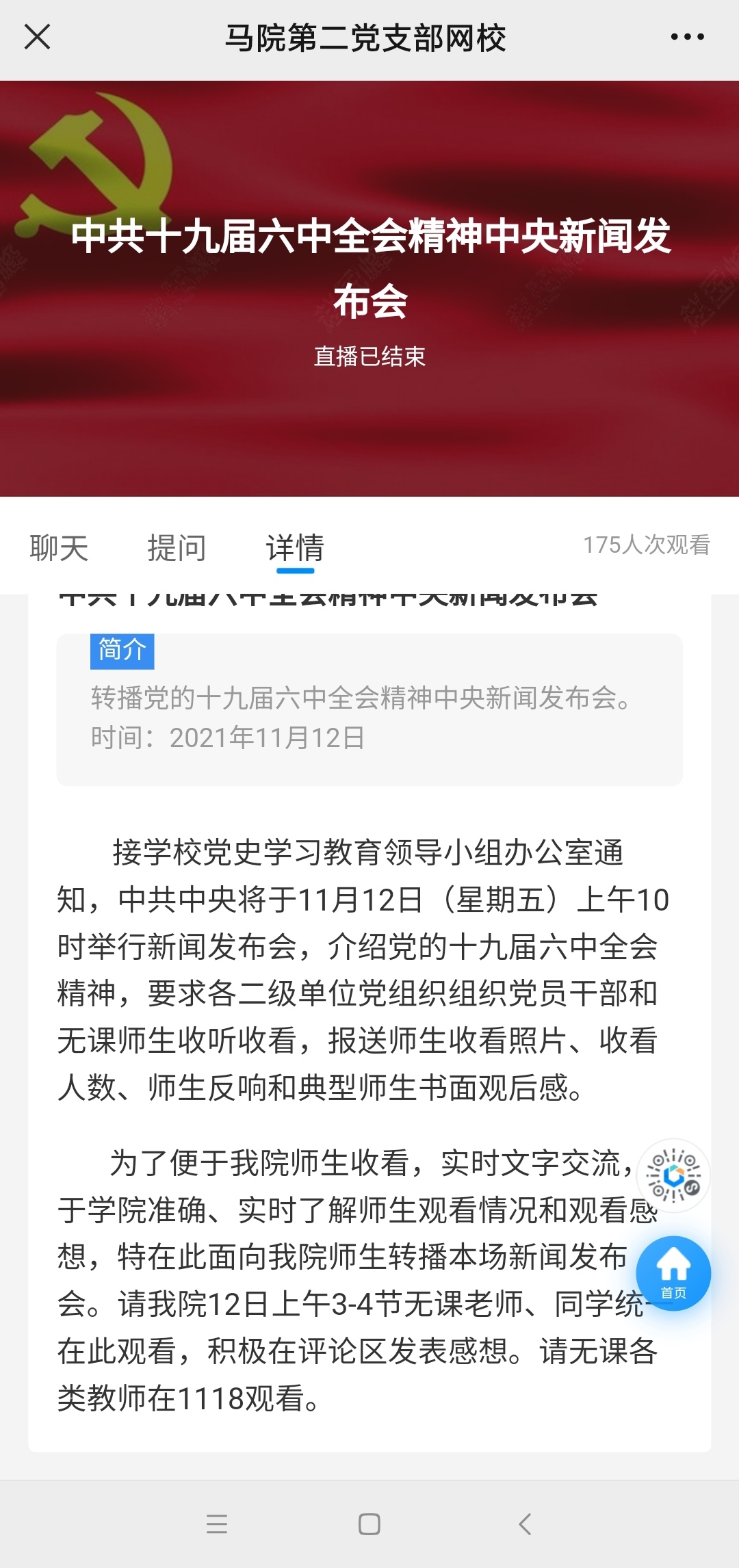 为了方便师生就地观看,方便公司掌握师生观看情况,方便实时讨论交流,公司还通过公司网络党校直播系统同步直播了央视新闻频道的直播。数据显示,公司至少有170多名师生观看了公司直播。