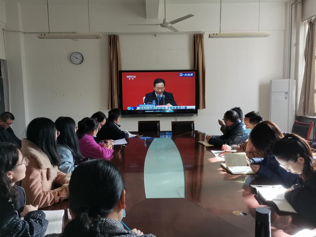 在公司会议室,20多名教师集体观看了直播。直播结束后,公司经理、总支临时负责人对全会精神进课堂作了初步安排,要求公司要迅速将全会精神合理融入课程教学。思政课部各教研室要在公司指导下,形成全会精神进课堂指导意见或具体方案。有条件的,要尽量在计划的教学体系中渗透全会精神。没有条件的,可以从原教学计划中分割一定时间单独宣讲全会精神。
