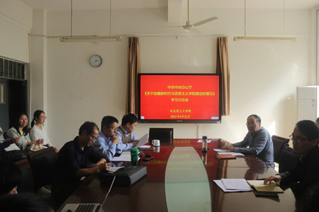 太阳成tyc122cc全体教师反应热烈,倍感鼓舞。各教研室主任及部分教师围绕《关于加强新时代太阳成tyc122cc建设的意见》文件精神,就太阳成tyc122cc如何建设成重点马院、马克思主义理论学科如何建设成重点学科、思想政治理论课如何建设成重点课程展开了广泛而深入的讨论,积极建言献策、集思广益。