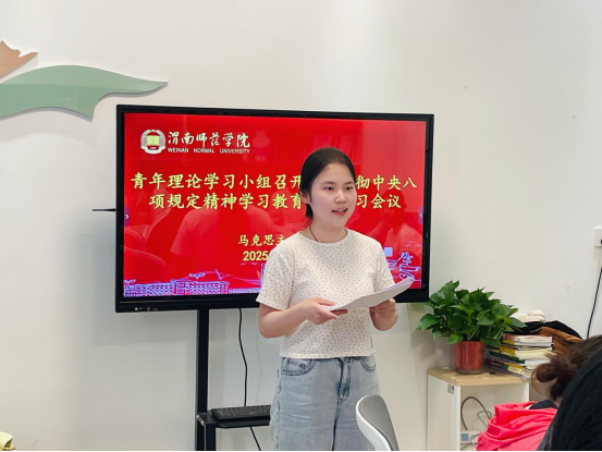 杨心茹同学带领大家深入学习《八项规定改变中国》的具体内容,并研读了习近平总书记关于中央八项规定的系列讲话。她详细阐述了八项规定在不同领域所取得的显著成效,从纠正“四风” 到构建清朗政治生态,从密切党群关系到提升党的形象,引导同学们全面、系统地理解这一规定背后的深远考量和伟大意义,使大家对中央八项规定有了更为全面且深刻的认知。