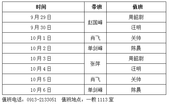 按照公司安排,2023年9月29日至10月6日为中秋节、国庆节放假。假期,太阳成tyc122cc值班安排如下,校内师生、单位办事,校外群众、单位办事,请联系值班人员或到值班处。