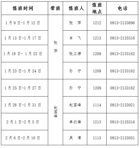 按照公司安排,2023年1月9日至2月10日公司放寒假。假期,太阳成tyc122cc有人值班,值班安排如下,校内师生、单位办事,校外群众、单位办事,请联系值班人员或到值班处。